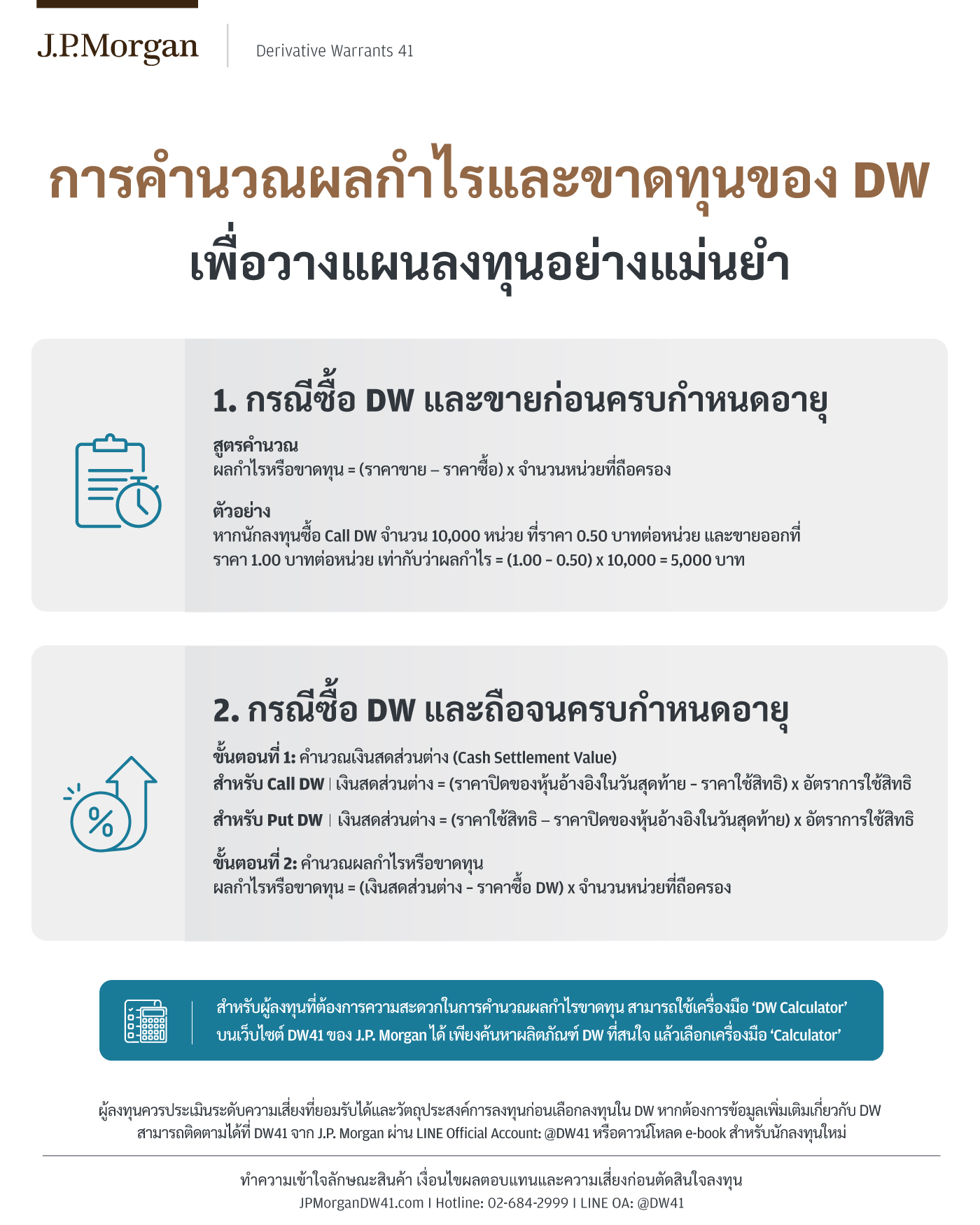 สำหรับผู้ลงทุนที่ต้องการความสะดวกในการคำนวณผลกำไรขาดทุน สามารถใช้เครื่องมือ ‘DW Calculator’ บนเว็บไซต์ DW41 ของ J.P. Morgan (https://www.jpmorgandw41.com/th/search-compare) ได้ เพียงค้นหาผลิตภัณฑ์ DW ที่สนใจ แล้วเลือกเครื่องมือ ‘Calculator’