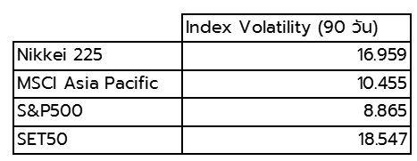 ดัชนี Nikkei 225 Stock Average (NIKKEI) มีความผันผวนย้อนหลัง 90 วันที่สูงกว่าหลายดัชนีในภูมิภาคและในฝั่งสหรัฐฯ ซึ่งค่าความผันผวนที่สูงกว่านี้ ส่งผลให้ดัชนีมีการเคลื่อนไหวจากราคาเฉลี่ยมากกว่าดัชนีอื่นๆ และเปิดโอกาสในการลงทุนทั้งในตลาดขาขึ้นและตลาดขาลง