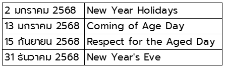 วันดังต่อไปนี้เป็นวันที่ตลาดหลักทรัพย์แห่งประเทศไทยเปิดทำการ แต่ไม่มีการดูแลสภาพคล่อง NIKKEI41 DW เนื่องจาก Nikkei 225 Futures ไม่มีการซื้อขาย นักลงทุนโปรดระมัดระวังการลงทุนในวันดังกล่าว
